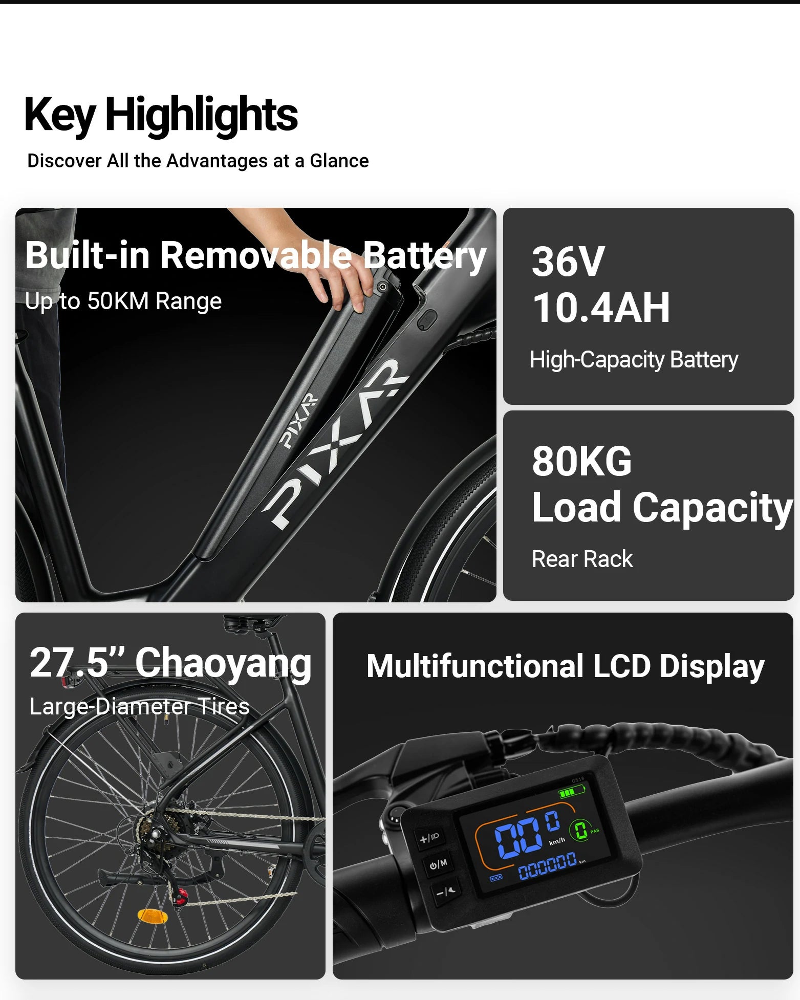 250W Motor | 36V 10.4AH Battery | 32km/h Speed | 35-50km Range