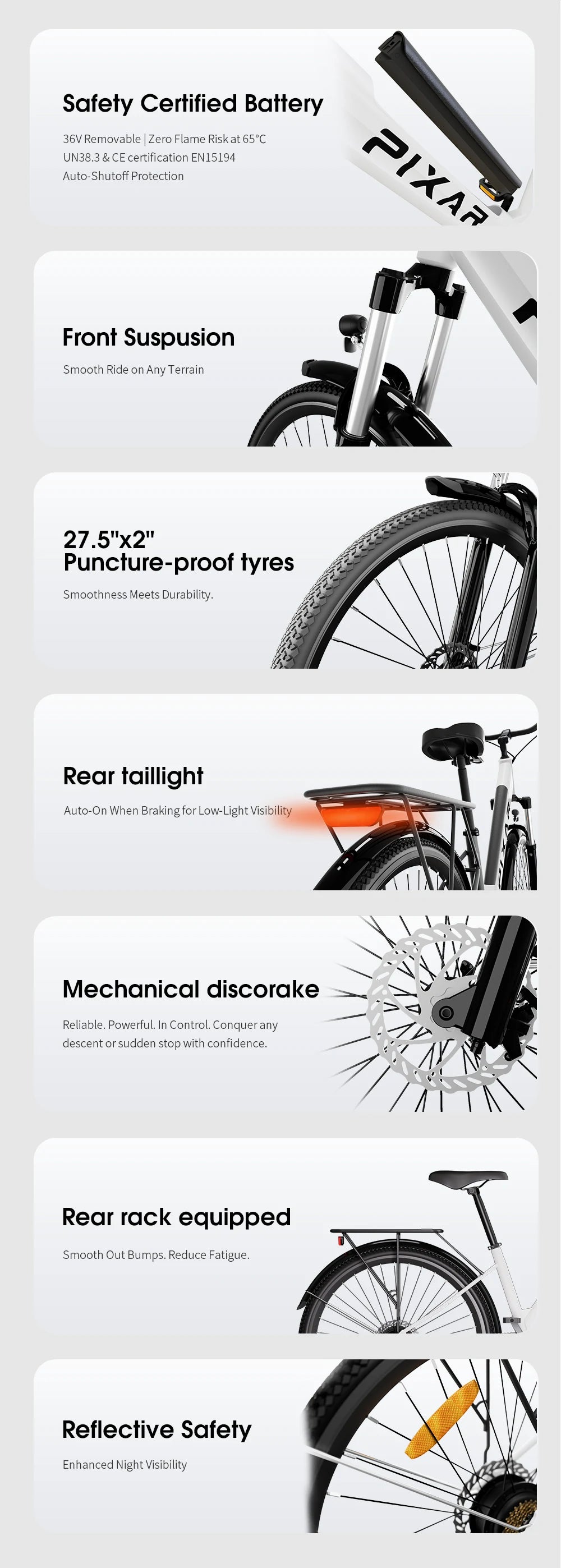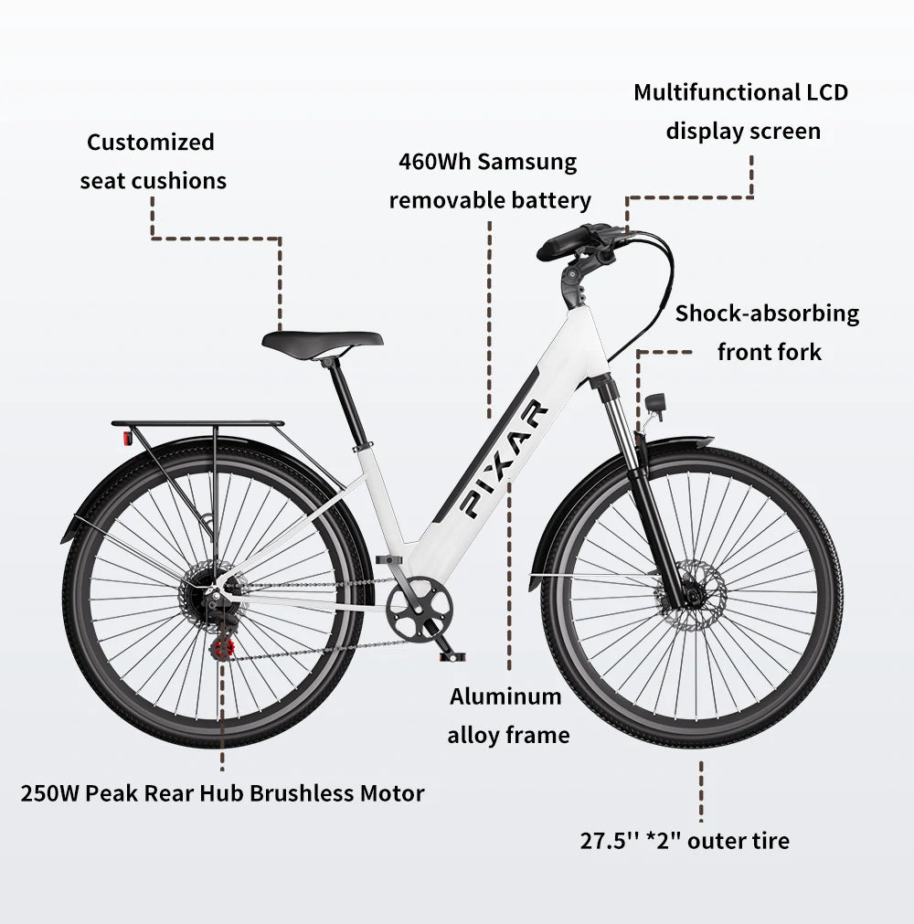 After six months of daily use on my 15km round-trip commute, the PIXAR Cruiser has completely transformed my relationship with urban transport. The 250W rear hub motor delivers smooth, consistent power that makes light work of the steep hill near my office without ever feeling jerky or overwhelming. I typically ride in assist level 2 or 3, which perfectly balances effort and battery conservation. The advertised 85km range is realistic; I achieve about 78-82km in mixed city riding with some stops and starts, which means I only charge every 3-4 days. The 27.5-inch wheels coupled with the hardtail suspension absorb potholes and uneven pavement remarkably well, making for a far more comfortable ride than my old rigid-frame bike. The hydraulic disc brakes are the unsung heroes—they’ve been flawless in sudden stops during rainy commutes, offering immense stopping power with just a light squeeze. The IPX6 waterproofing is legit; I’ve been caught in two heavy downpours and the electronics, including the display and motor, showed no issues. At 29kg, it’s not a lightweight, but the weight lends a stable, planted feel at the 25km/h max speed, especially when carrying my work bag. My only critique is the 4-6 hour charging time feels a tad slow in our fast-paced world, but planning overnight charging solves that. For anyone living in a hilly city and wanting to arrive at work sweat-free, this is a brilliant investment.