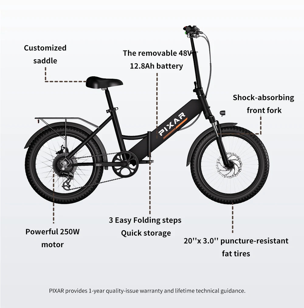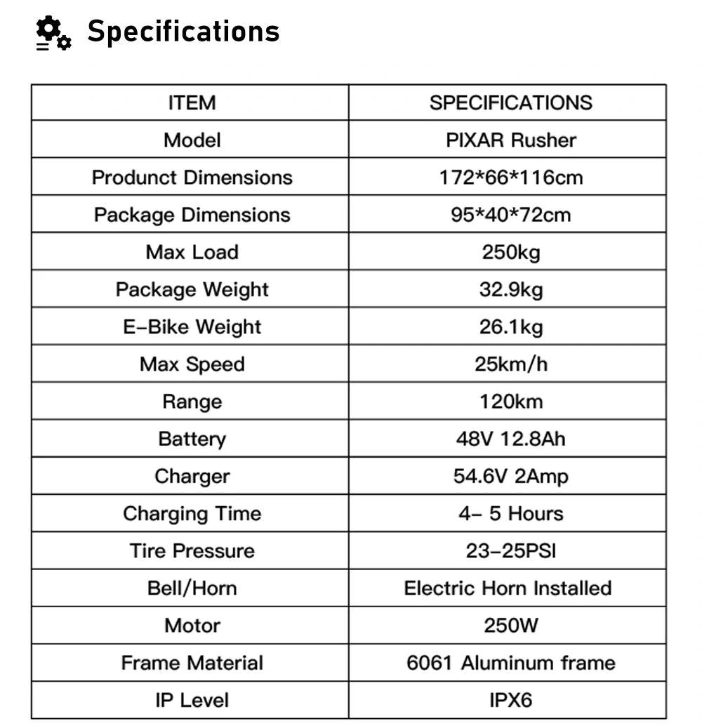 This PIXAR Rusher has completely changed my daily commute. The 250W motor provides more than enough power for city hills, and I can easily hit the max speed of 25km/h without breaking a sweat. The battery lasts me a full week of riding to work, which is about 10km each way. I love the sturdy build and the fact that it can handle my 100kg weight plus groceries with ease. The only downside is the mechanical brakes – they work fine, but I wish they were hydraulic for better stopping power in the rain. Overall, an excellent investment for urban living!