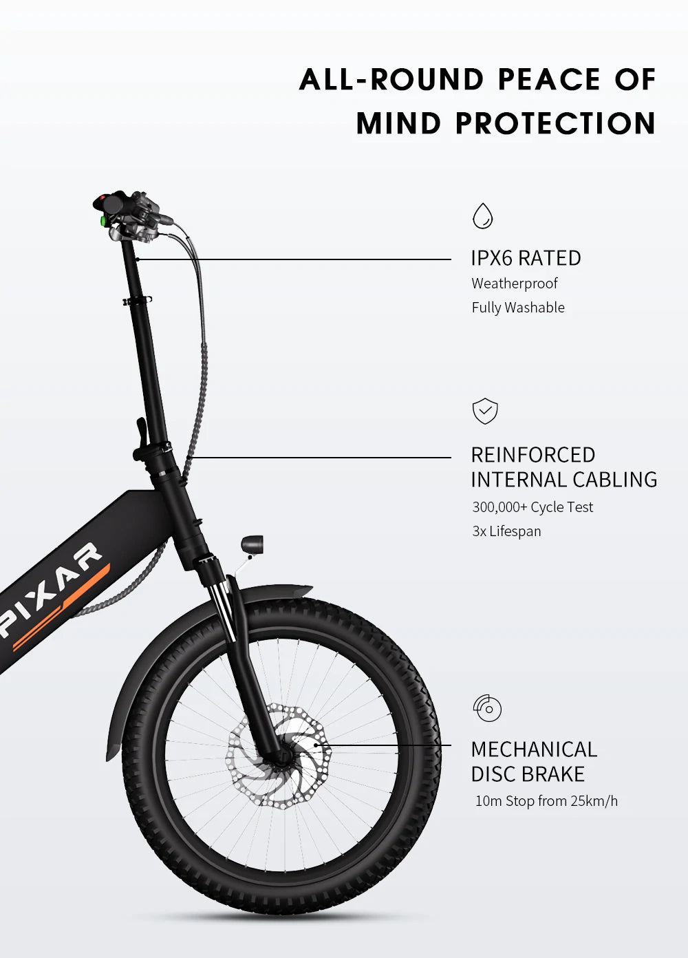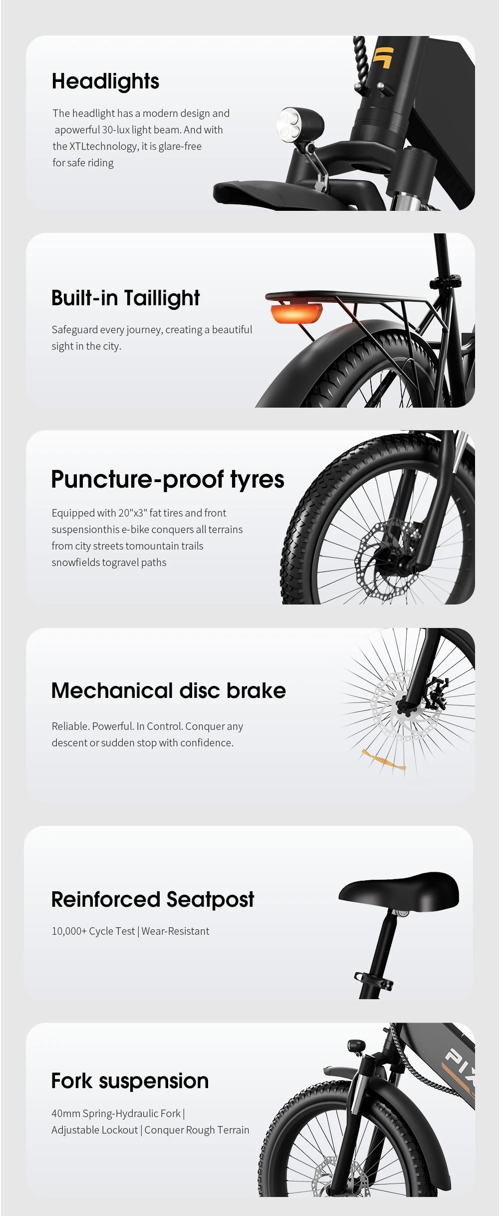 I've taken my Rusher on several weekend trails and it performs brilliantly. The hardtail suspension is firm yet comfortable, and the 20*3 inch wheels glide over rough paths. The battery range is accurate – I got about 80km on a single charge with moderate pedal assist. The IPX6 waterproofing gives me peace of mind in sudden showers. It's a bit heavy at 26kg, but the electric assist makes it feel light. Highly recommend for anyone who loves mixed-terrain cycling!